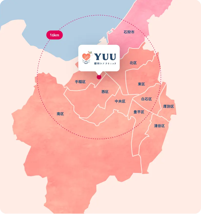 こんにちは。YUU緩和ケアクリニックです。札幌市手稲区を中心に、在宅緩和ケア・訪問診療を行っているクリニックです。 がんなどの病気と診断され、緩和ケアが必要になった患者さんが、ご自宅をはじめ「過ごしたい場所」で安心して療養できることを大切に、医療面・生活面の両方からサポートしています。 在宅緩和ケアの第一歩は、「支える人たちがつながること」だと私たちは考えています。患者さんとご家族が抱える不安や困りごとに対して、医師だけでなく、訪問看護・薬局・ケアマネジャーなどの多職種と連携し、必要な支援へスムーズにつなげていきます。 人と人を結びながら、患者さんがご自宅でその方らしい暮らしを続けられるよう、チームで支えることが私たちの役割です。